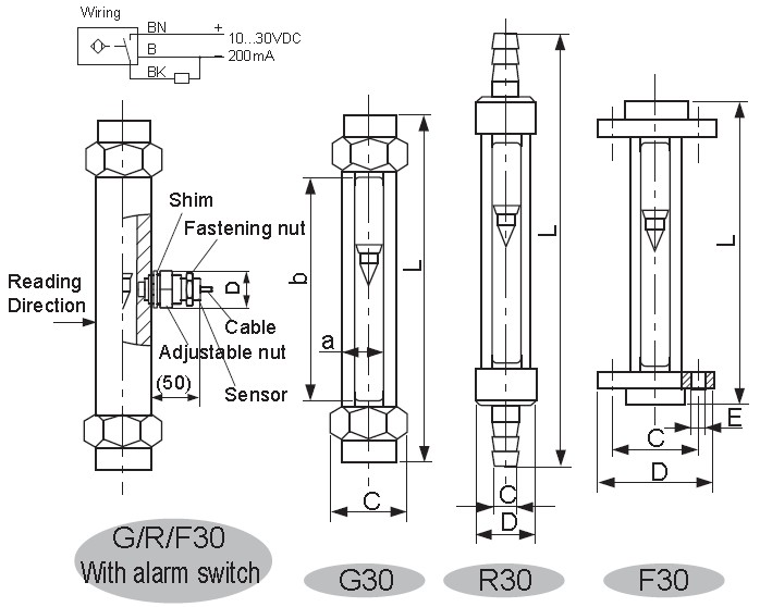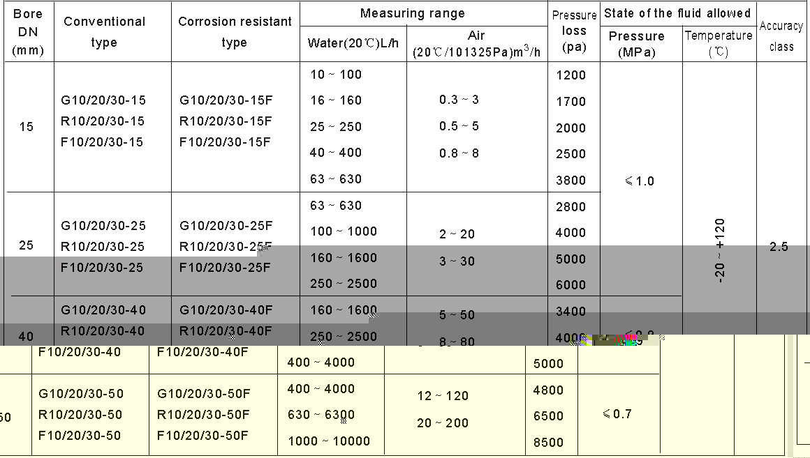 G/R/F10, 20, 30 glass tube rotameter has three types of connection: pipe thread (G10 type), hose pipe (R10 type) and flange ( F10 type). Its maximal working pressure and maximalworking temperature are higher than other glass tube rotameters with the same bore. It's divided into normal type (Measuring general noncorrosive fluid) and corrosion resistant type (Measuring corrosive fluid.). The meter is featured with compactness, light structure, nice looking, convenient maintenance, safe and reliability, easy installation.The flange of F10 type can rotate to be aligned with the pipe holes on the spot vessel.