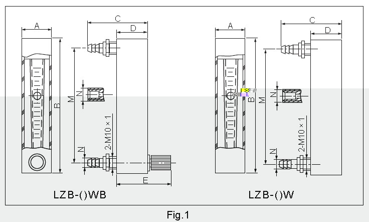 LZB-()WB series flowmeter equip with control valves,LZB-()W series flowmeter without control valve,see the outline and installation drawing as following:Fig.1 and Table 1
